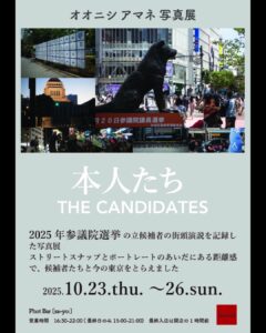 2025年 7月20日投開票された第 27 回参議院選挙。東京都選挙区で告示から開票日前日まで街頭演説に立った候補者26人を偏りなく記録した写真展。ストリートナップとポートレートのあいだの距離感で、候補者たちといまの東京をとらえた。タイトル「本人たち」は、選挙運動中に候補者本人の現場を示す「たすき」や「幟」に由来する。