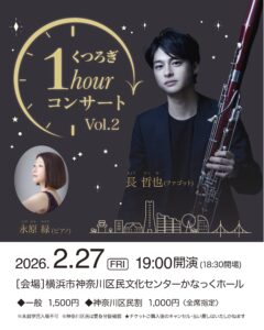 2025年度新企画の第2回目。2月は、東京都交響楽団首席ファゴット奏者・長哲也氏をお迎えいたします。ピアノはアンサンブルピアニストとして国内外の演奏家と共演を重ねている永原緑氏。お仕事終わりに鑑賞しやすい、夜公演(19:00開演)です。1日の疲れを癒すファゴットとピアノの素敵な演奏をホールでご鑑賞ください。