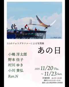 鳥人間コンテストに関わった人たちの思いとパイロットの決断、初めて海外でライブを撮った熱気、一晩中空を見上げていた日、自分の誕生日をイメージしたもの、日常の中でのちょっとした「あの日」を日記のように綴ったものなど、5人それぞれの視点で追った写真を展示します。