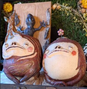 1/19から展示している「ぶぶのちいさなむら陶作品」陶器の恐竜・ちょうちんアンコウ・木の妖精ぶぶゴラをはじめ、曼荼羅アートやあみぐるみ、ハンドメイドアクセサリー、ニット帽、駅チカスイーツから占いやマッサージなどのリラクゼーションブースも