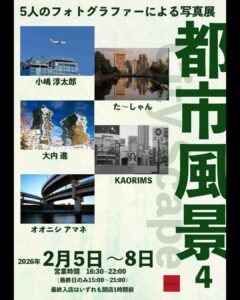 いくつもの建築物や建造物が重なり合うことで見えてくる風景、人々の往来と熱量、都市だけが持つ静けさなど、5人のフォトグラファーが捉えたさまざまな都市風景を展示します。