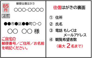 - ・観覧をご希望の方は、本ページ記入例のとおり「往復はがき」でお申込みください。