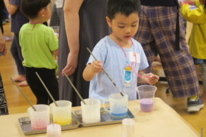 赤と青と黄色と白のえのぐは魔法のえのぐ。いろいろな色をつくって大きな絵を描いてみよう。